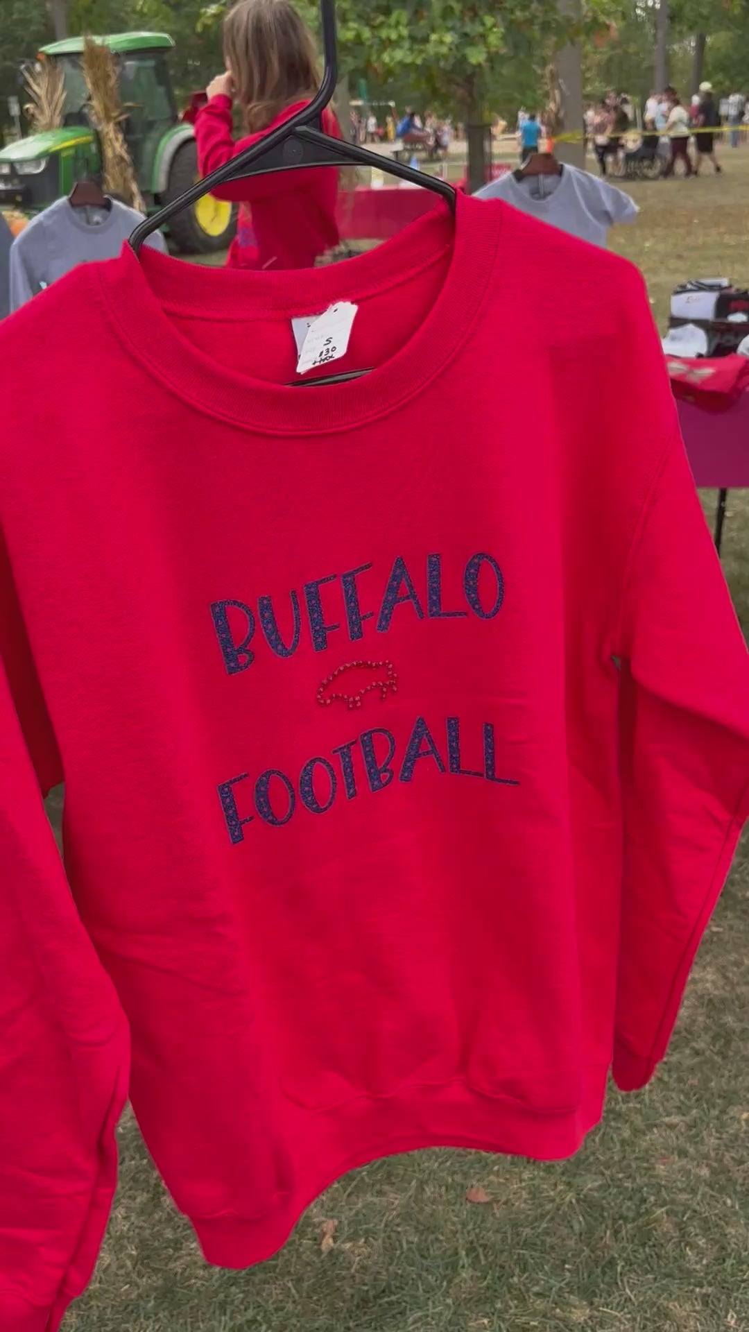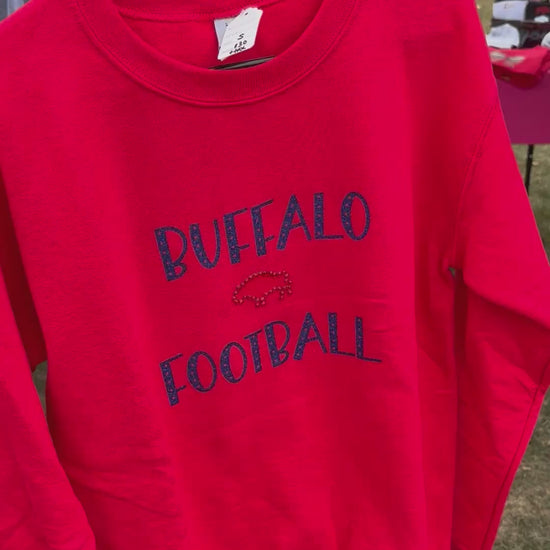 Buffalo sparkle crewneck! Blue glitter lettering with red Buffalo rhinestone details. Perfect combination of cute and comfy for cheering on your Buffalo Bills! ♥️