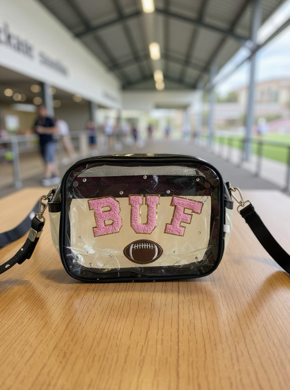 Stadium approved clear cross body bag. Adjustable strap included. Single zipper pocket on back. Cute, practical and just the right amount of bling! GO BUFFalo!
